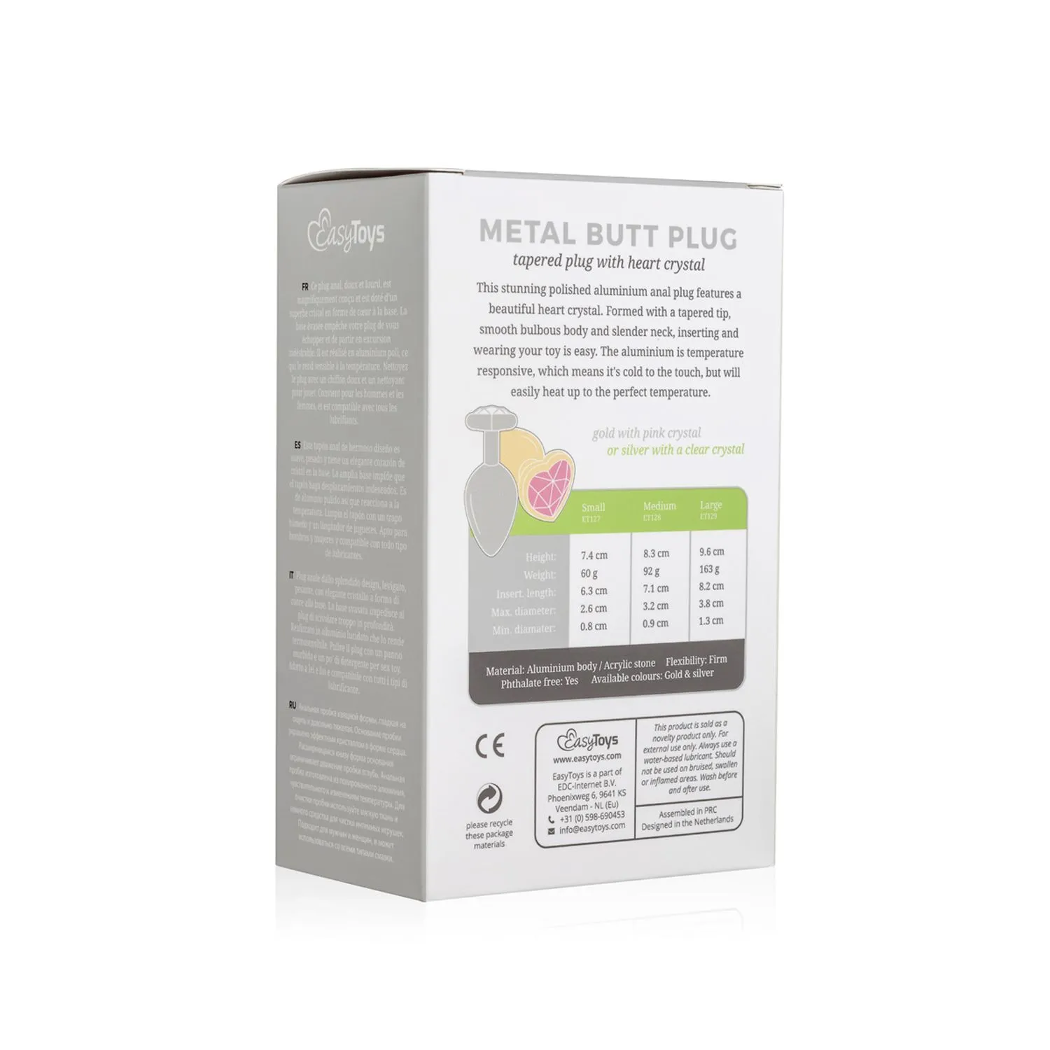 Verleidelijke, zilverkleurige buttplug met transparant hartje van EasyToys Anal Collection. Dit speeltje is perfect voor een liefdevol samenspel met je partner. Breng de buttplug bij je partner of jezelf in en geniet van het kristallen hartje dat tussen de billen pronkt. Met deze plug laten jullie je liefde en geilheid voor elkaar zien. De plug heeft een glad middenstuk met een taps toelopende top. Maak de seks extra sensueel door de buttplug met je geliefde af te wisselen. Vergeet dan niet om hem tussendoor hygiënisch schoon te maken.