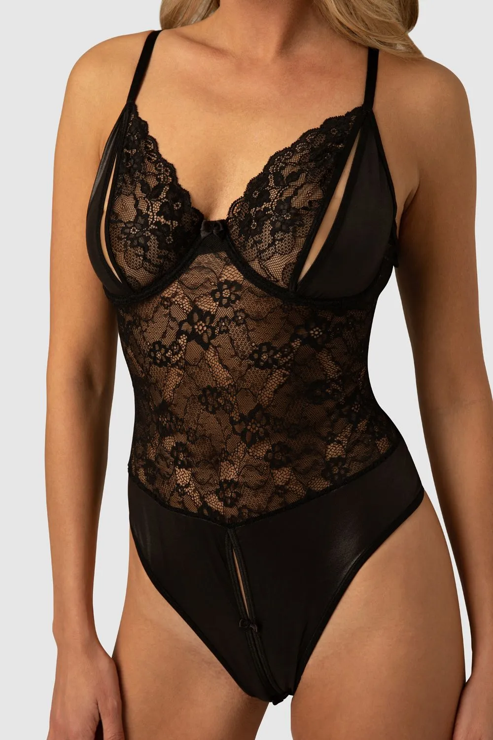 Pikante, sensuele body van het merk BESIRED. Een verleidelijke combinatie uit kant en zacht wetlook materiaal maken deze body zeer speciaal. Openingen aan de cups en in het kruis zorgen voor extra spanning!