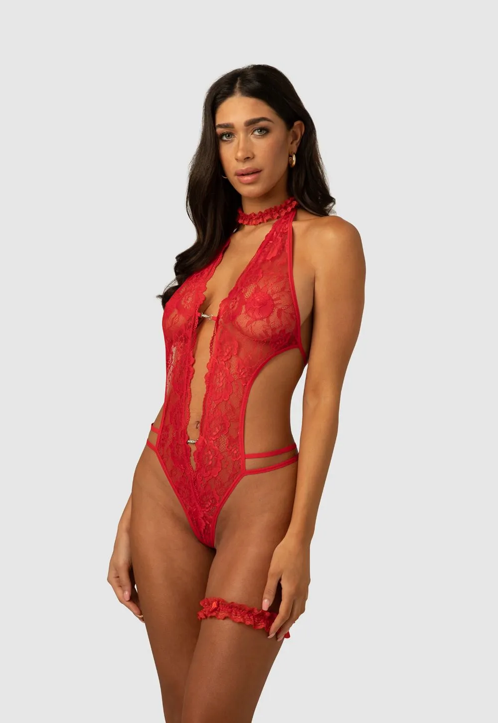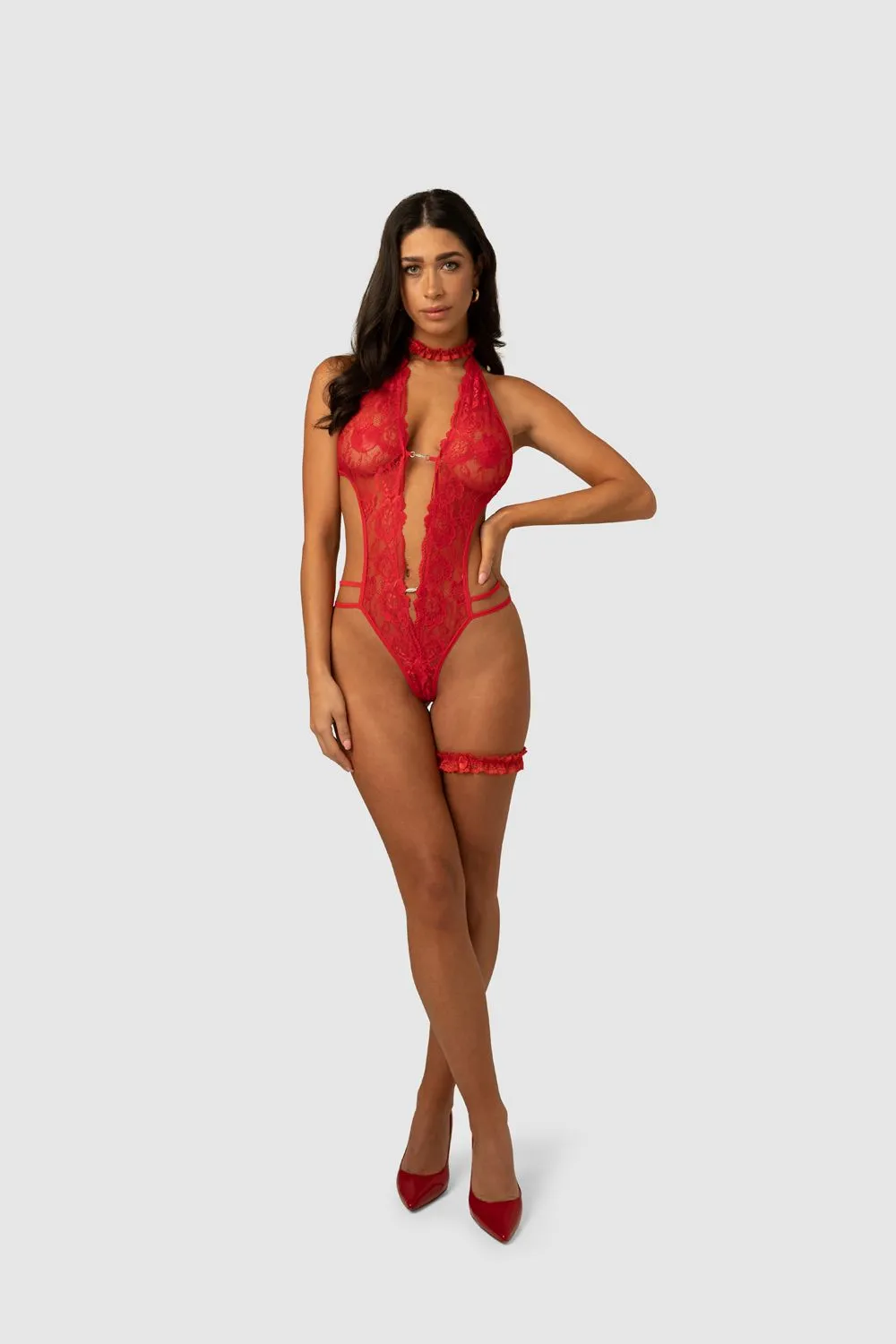 Merk: Christine le Duc. 3-Delige Bodyset Renee; bestaande uit een super verleidelijke body, een zacht kanten nekbandje en een sexy kousenband. Om het extra spannend te maken heeft Bodyset Renee een open kruisje. Deze set komt uit de collectie van Christine le Duc.