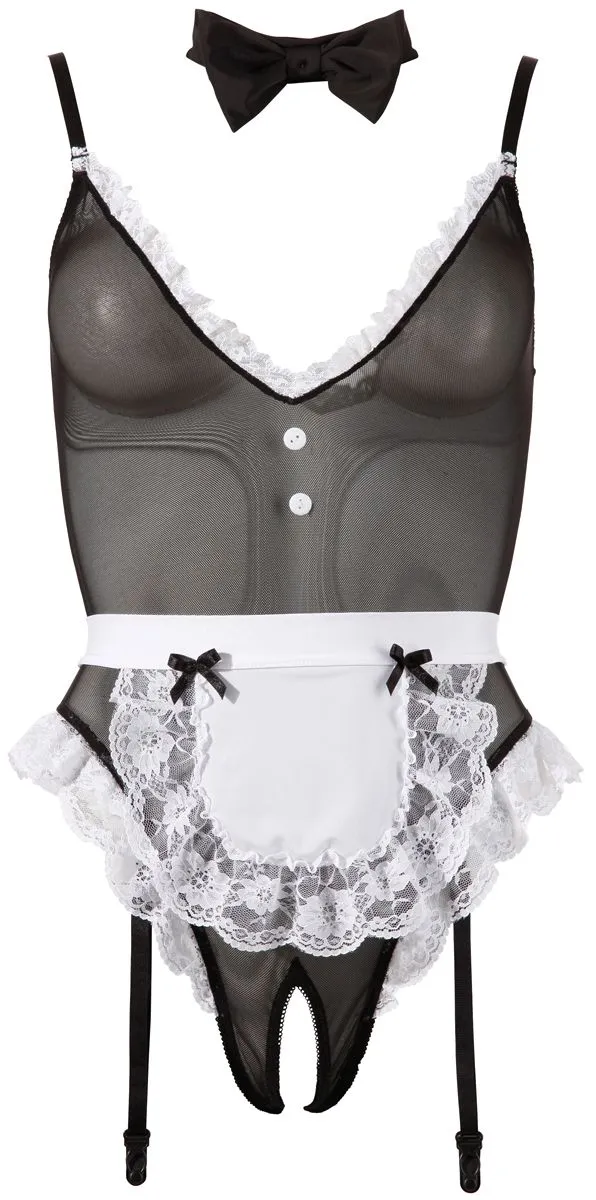 Een rollenspel kan je seksleven enorm doen opleven. Logisch ook, je partner zal je onmogelijk kunnen weerstaan in deze spannende serveerster outfit! De body is gemaakt van doorschijnende zwarte stof en heeft witte ruches en een open kruisje. Door de verstelbare bandjes is hij eenvoudig op maat te maken. De set wordt geleverd met schortje en halsband met strikje.