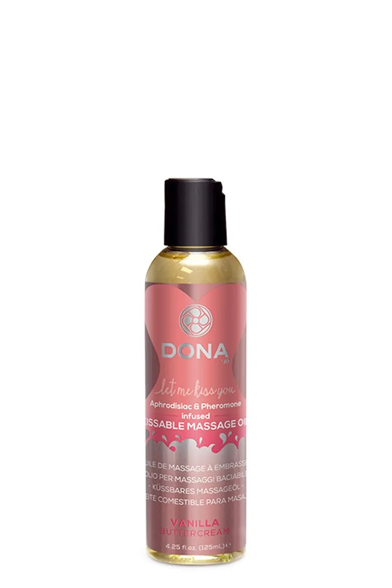 Een vervelend minpuntje bij een massage, kan de massageolie zijn. Sterke geuren zoals eucalyptus of pepermunt ruiken vaak wel aangenaam. Maar wanneer je hierna je partner kust, daar waar je net olie hebt aangebracht, blijkt de smaak tegen te vallen. Dona Kissable Massage Olie Vanille Buttercream, is hiervoor de ultieme oplossing. Deze heerlijke massageolie verzorgt de huid en is eet- en likbaar. Deze olie bevat feromonen voor een nog intenser geurbeleving. Jullie zullen niet van elkaar af kunnen blijven!