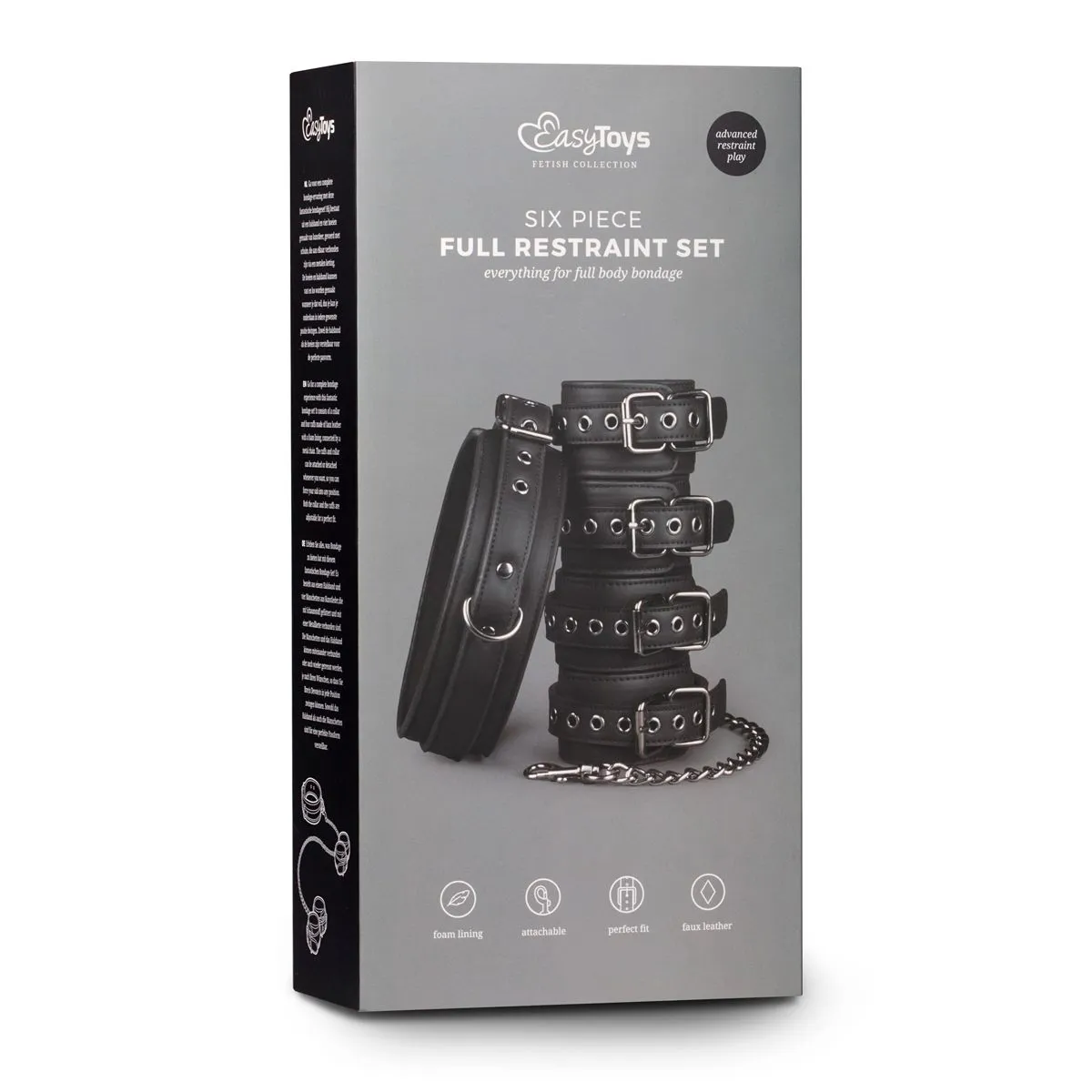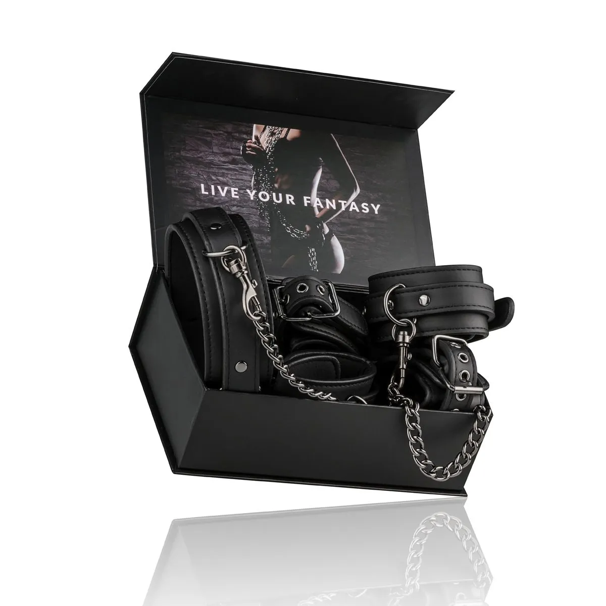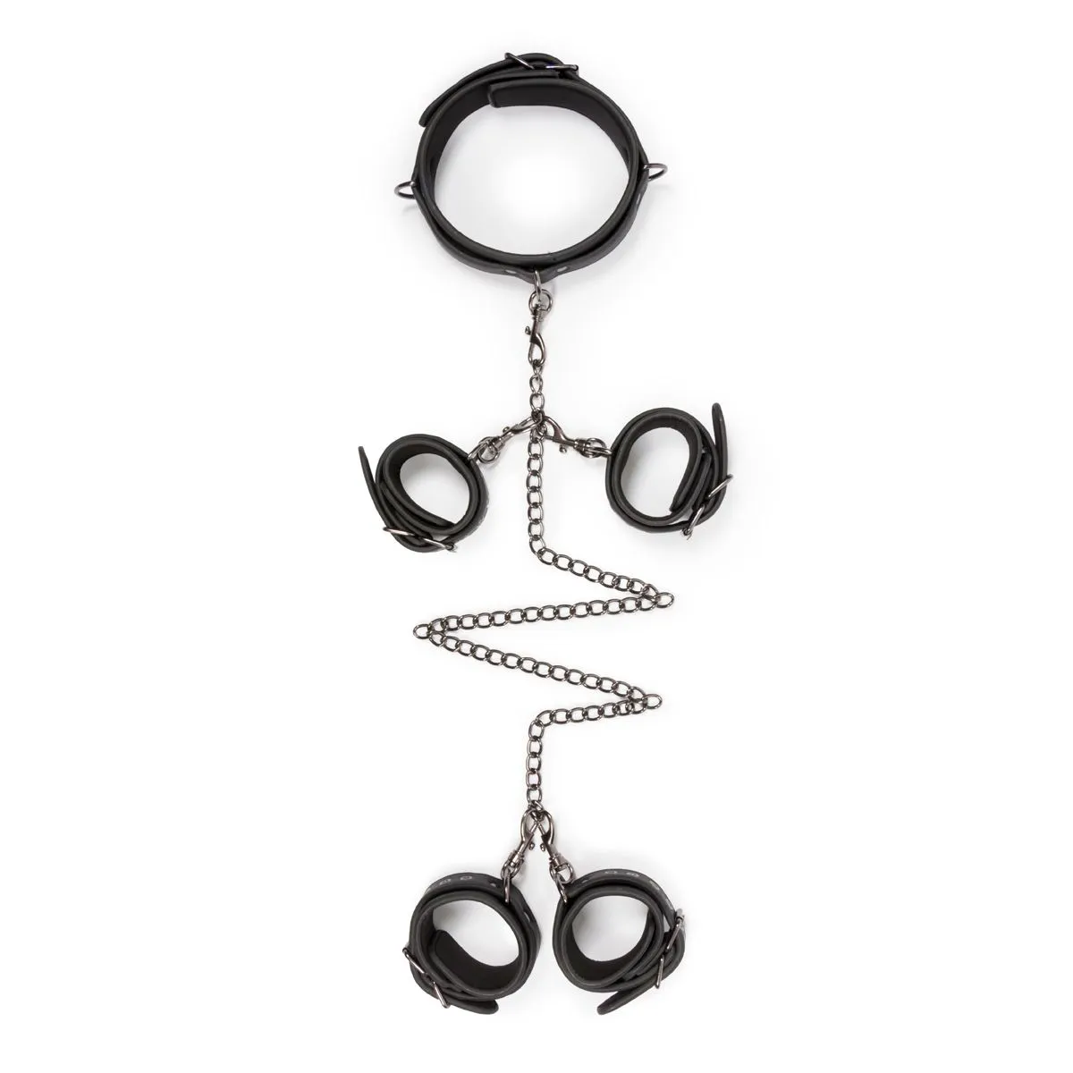 De mogelijkheden zijn eindeloos met deze geweldige bondage-set! Hij bestaat uit een halsband, handboeien en enkelboeien die gemakkelijk van elkaar gescheiden kunnen worden door middel van de clipsluitingen. De speeltjes zijn gemaakt van stevig kunstleer gevoerd met schuim, waardoor ze duurzaam zijn en comfortabel om te dragen. De halsband is verstelbaar van 35 tot 53 cm, de handboeien van 11 tot 28 cm en de enkelboeien van 13 tot 30 cm. Gebruik deze speciale set in combinatie met andere spannende speeltjes, zoals ball gags, zweepjes en tepelklemmen voor een extra opwindende ervaring.