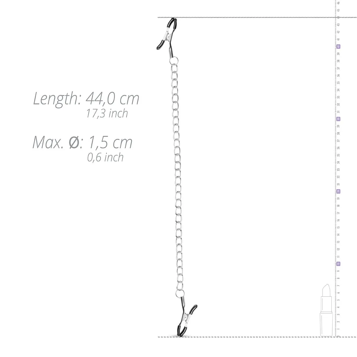 Deze metalen tepelklemmen zijn gemaakt voor tepels die vragen om meer. De sterke klemmen geven veel knelling op de tepels en zijn voorzien van een metalen ketting. Voel hoe de klemmen stevig om je tepels zitten terwijl het koude metaal je lichaam raakt en prikkelt. Ben jij er klaar voor?