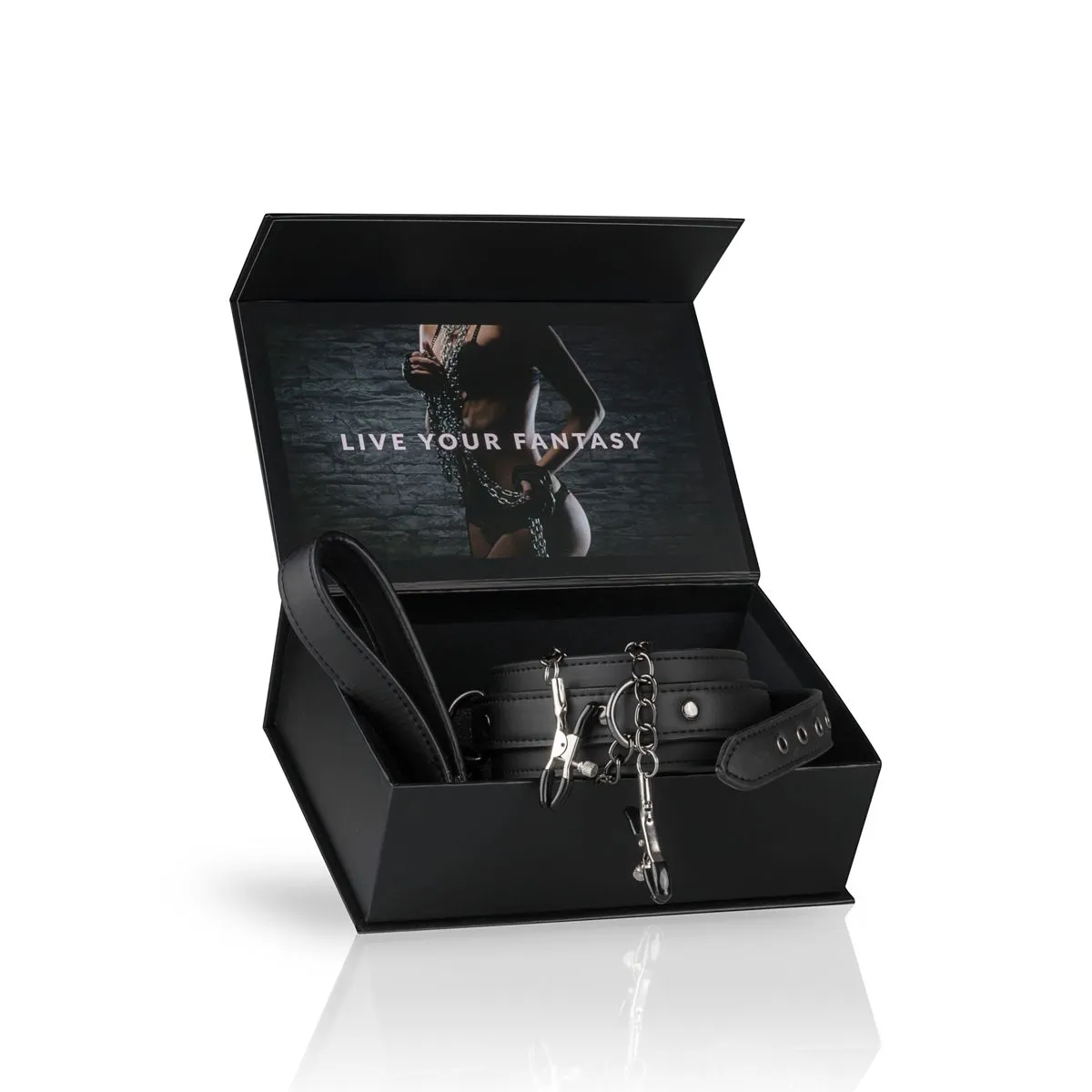 Met deze halsband inclusief tepelklemmen kan je je partner domineren en genieten van het gevoel van controle! De halsband is gemaakt van kunstleer, wat zorgt voor een luxe uitstraling. Hij is verstelbaar en zal dus altijd passen. De halsband en de klemmen zitten aan elkaar vast met metalen kettinkjes. Met deze halsband ben je verzekerd van een opwindend en sexy SM-spelletje.