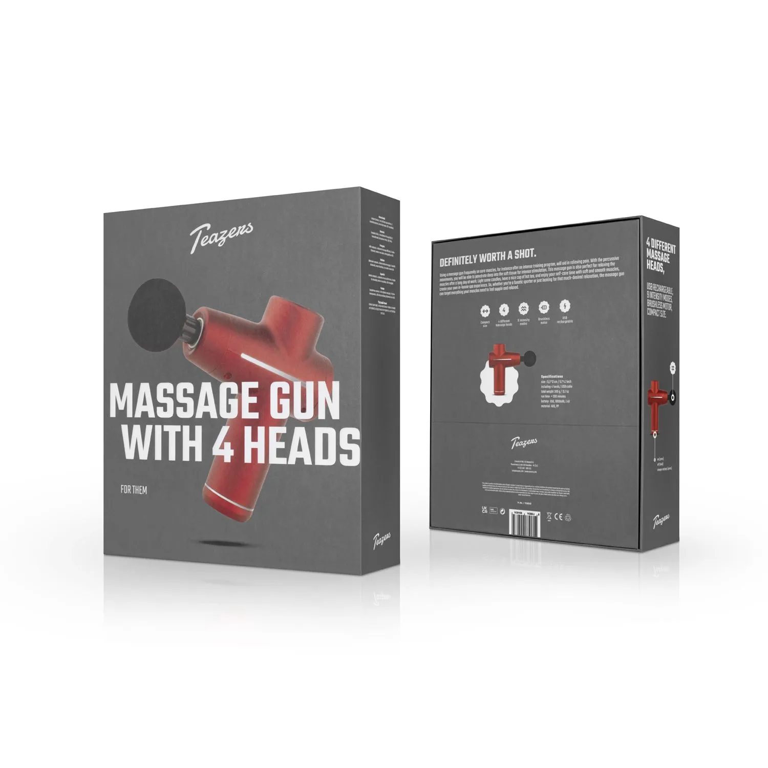 Deze massage gun uit de Teazers collectie is perfect voor een heerlijk ontspannende massage! Door middel van krachtige trillingen wordt de bloedsomloop gestimuleerd en worden afvalstoffen afgevoerd uit de spieren. Dankzij het compacte formaat ligt hij perfect in de hand en met de 4 verschillende massagekoppen kun je naar wens afwisselen. De massage gun beschikt over 9 verschillende intensiteit standen welke je eenvoudig kunt bedienen met de push buttons. Gebruik voldoende massage olie voor de beste ervaring.