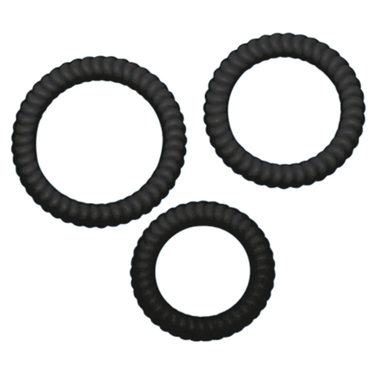 Het lusttrio voor imposante erecties! Set van 3 geribbelde zwarte penisringen met verschillende diameters (2,6, 3,0 & 3,5 cm). Ringdikte elk 7 mm. Ook ideaal om de testikels mee in te snoeren.